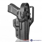 Модель DNMC-1201B KYDEX - кобура из кайдекса для скрытого ношения пистолетов GP T12 и TQ2 внутри штанов. Крепление на ремень шириной до 40 мм на быстросьёмной клипсе (пластиковой или стальной). Кобура сделана из кайдекса толщиной 2 мм с фактурной поверхностью. Пистолет фиксируется в кобуре за скобу. Есть регулировку плотности посадки в кобуре - два прижимных винта. Формовка выполнена по точной 3D модели пистолета GP. Цвет кайдеса - чёрный матовый. Производство компании Dynamiс Holsters (Эстония).