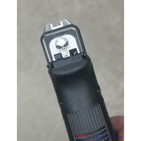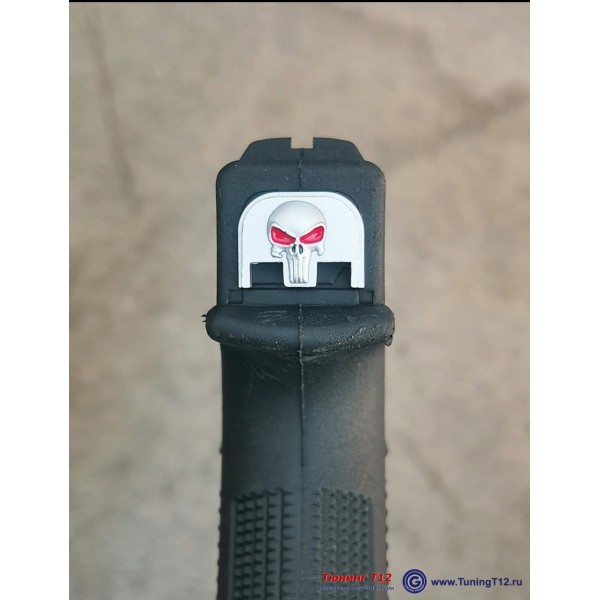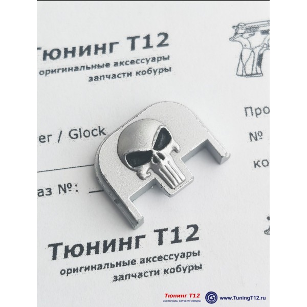 Задняя пластина затвора с фактурным 3D изображением черепа для пистолетов Glock калибра 9х19. Модель 3D Каратель SLV. Изготовлена из прочного алюминиевого сплава Al 6061 T6 с покрытием серебристой краской. Рисунок выпуклый "3D", выполнен фрезеровкой поверхности пластины. Деталь №14 на взрыв-схеме. Аналог по форме и назначению оригинальной детали Glock OEM 33783. Производство компании "MG Tuning" (Корея).