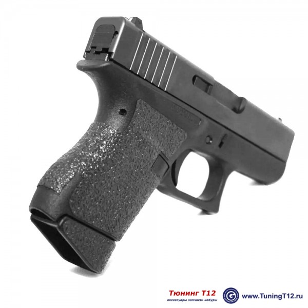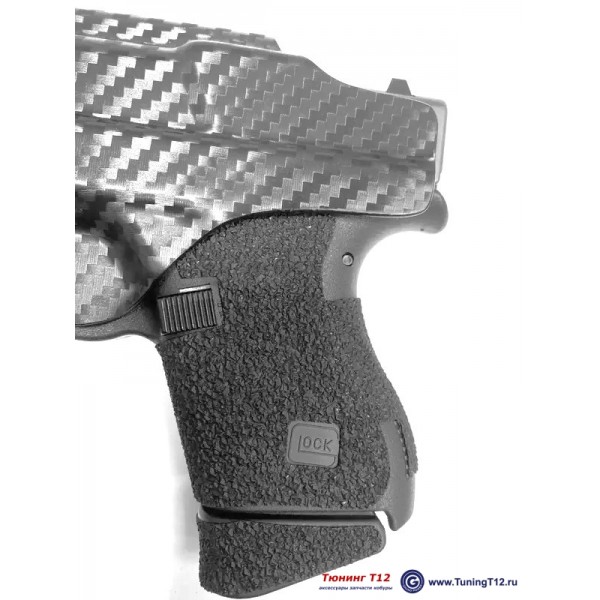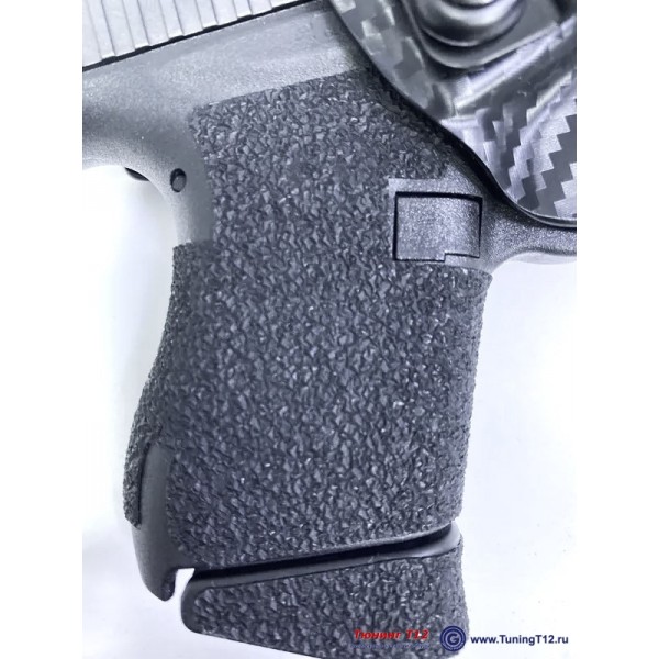 Тактическая накладка или наклейка-шкурка на рукоятку пистолета Glock 43. Модель X-Tape-G43. Изготовлена из тонкой резины толщиной 0,5 мм. Имеет фактурную противоскользящую поверхность. Не изнашивается, не крошится и не отклеивается от подложки. Подложка с адгезивнным слоем приклеивается к рукоятке и надёжно держится в любых условиях эксплуатации. Производство компании "Custom Glock Tuning" (Тайвань).