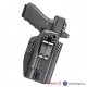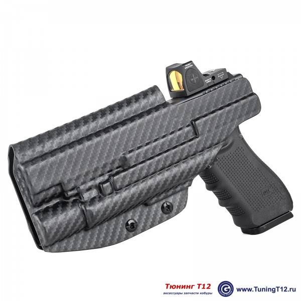 Преимущества модели: форма кобуры позволяет носить пистолет с установленным на затворе коллиматорным прицелом (любые модели) и высокими прицельными (мушка высотой до 12 мм). Удлинённая снизу - доступно ношение пистолета с длинным стволом с резьбой и защитной гайкой или установленым ДТК. При помещении пистолета в кобуру слышен характерный щелчок (posi click design) - он оповещает о полном погружении оружия и его фиксации в кобуре. Максимально тонкий профиль - толщина кобуры всего 1,5 мм, что позволяет использовать её и в любых оружейных сумоках (как внутренную кобуру).