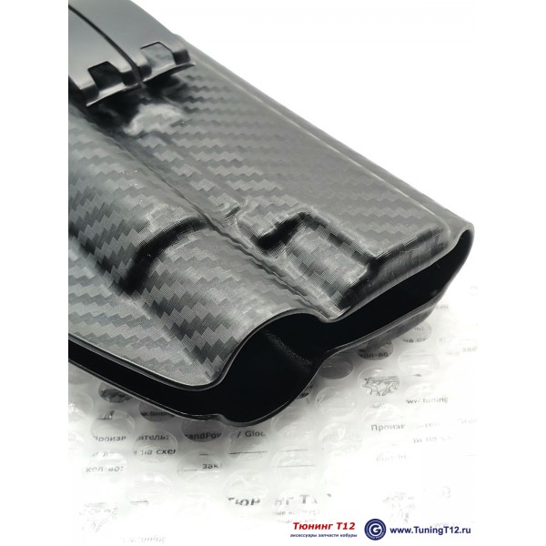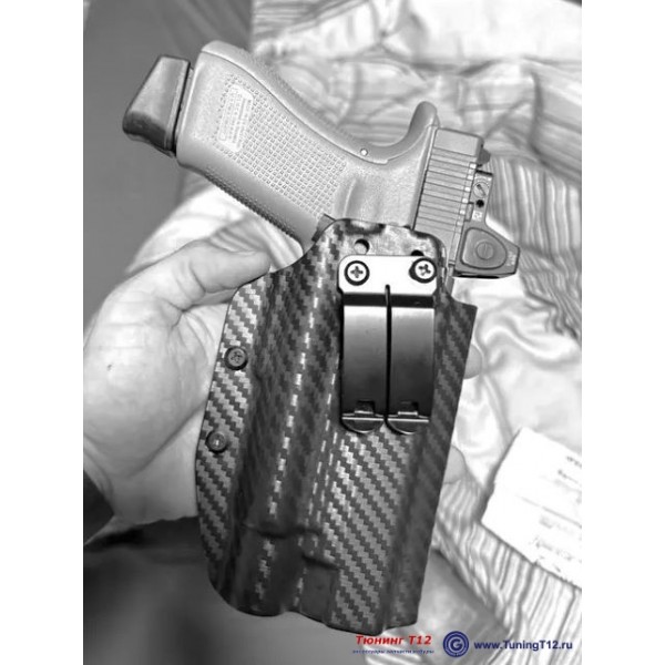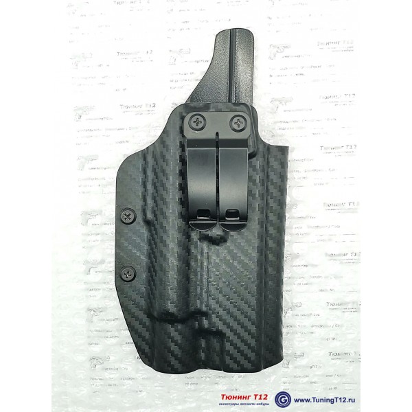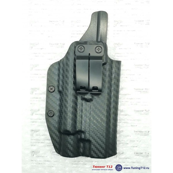 Модель MG-17OBPR Carbon - кобура из тонкого кайдекса для скрытого ношения пистолета Glock 17 внутри штанов с установленным фонарём Olight Baldr Pro R. Крепление кобуры на ремень шириной до 40 мм осуществляется на быстросьёмной стальной клипсе. Кобура сделана из кайдекса толщиной 1,5 мм (Kydex производста USA). Пистолет фиксируется в кобуре за фонарь. Есть регулировка плотности посадки пистолета в кобуре - два прижимных винта. Формовка выполнена по точной 3D модели пистолета. Цвет Black Carbon - матовый чёрный, с фактурной насечкой на поверхности имирующей углеродное волокно. Производство компании "Meigon" (США-Тайвань).