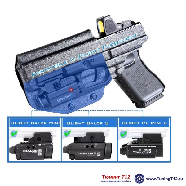 Кобура изготовлена для ношения пистолета Glock 17 Gen3/Gen4/Gen5 с установленным фонарём модели Olight Baldr S. Подходит так же для фонарей Olight Baldr Mini и PL Mini 2.