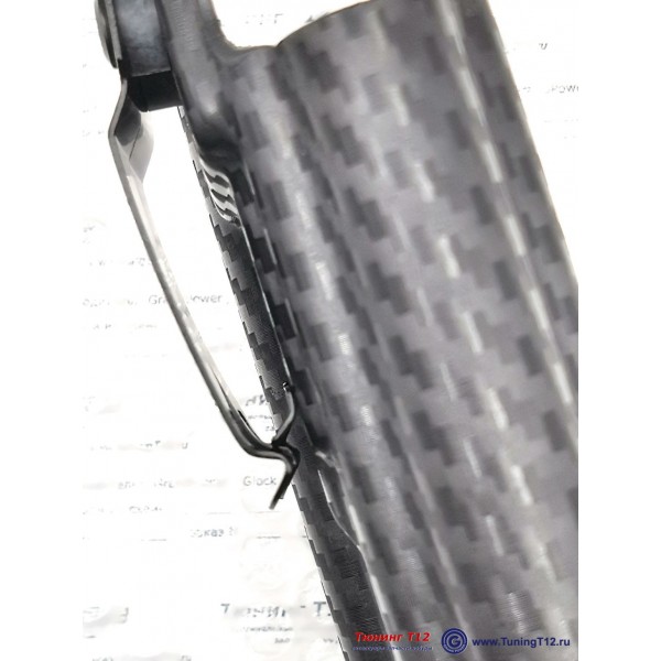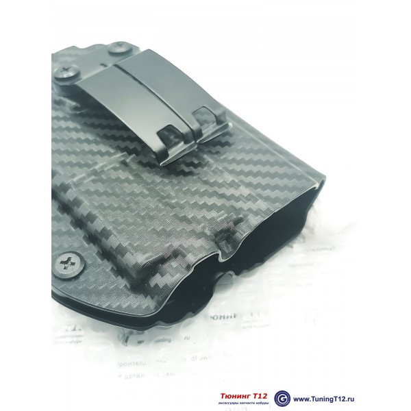 Модель MG-17OBS Carbon - кобура из тонкого кайдекса для скрытого ношения пистолета Glock 17 с установленным фонарём Olight Baldr S. Крепление кобуры на ремень шириной до 40 мм осуществляется на быстросьёмной стальной клипсе. Кобура сделана из тонкого кайдекса толщиной 1,5 мм (Kydex производста USA). Пистолет фиксируется в кобуре за фонарь. Есть регулировка плотности посадки пистолета в кобуре - два прижимных винта. Формовка выполнена по точной 3D модели G17. Цвет Black Carbon - матовый чёрный, с фактурной насечкой на внешней поверхности имитирующей углеродное волокно. Производство компании "Meigon" (США-Тайвань).