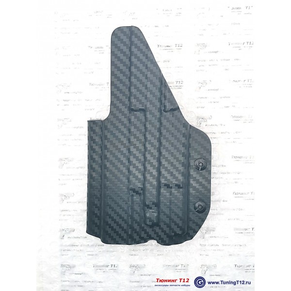 Преимущества модели: форма кобуры позволяет носить пистолет с установленным на затворе коллиматорным прицелом (любые модели) и высокими прицельными (мушка высотой до 12 мм). Открытая снизу - доступно ношение пистолета с удлинённым стволом с резьбой и защитной гайкой или установленым ДТК. При помещении пистолета в кобуру слышен характерный щелчок (posi click design) - он оповещает о полном погружении оружия и его фиксации в кобуре. Все внешние края и внутренние изгибы кобуры отполированы. Максимально тонкий профиль - толщина кобуры всего 1,5 мм (позволяет использовать её так же в любых оружейных сумках как внутренную кобуру).