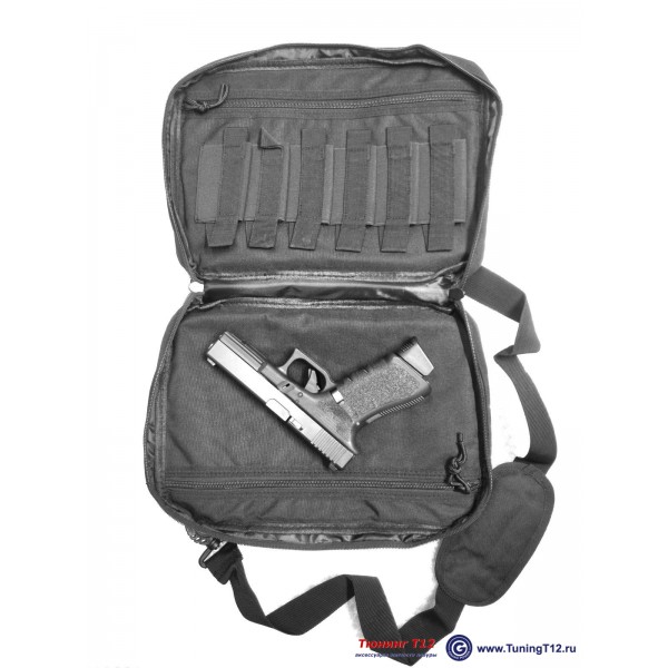 Практичный и удобный вариант для ношения, хранения и перевозки короткоствольного оружия, патронов, запчастей и различых оружейных аксессуаров. Размеры сумки позволяют перевозить в ней одновременно два пистолета (револьвера), запасные магазины, очки, наушники, инструменты и средства для чистки, а так же патроны. Всё что необходимо для выезда в тир или полноценной тренировки на стрельбище.