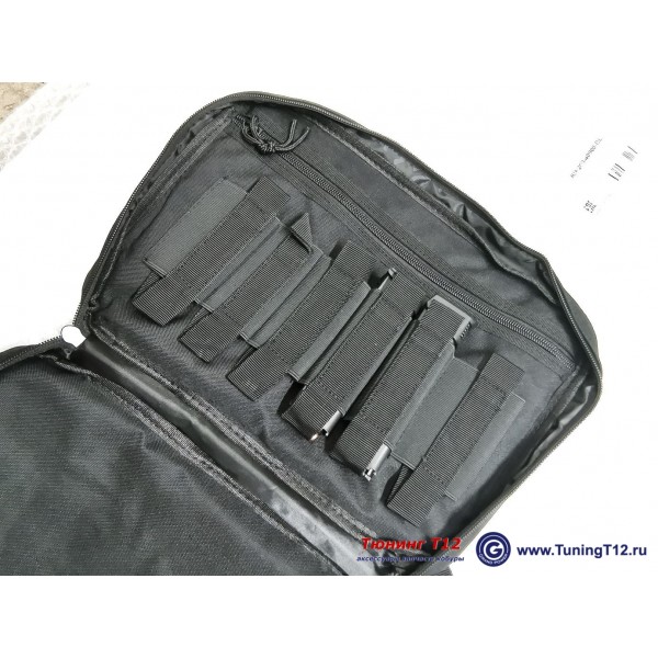Внутри сумки одно общее отделение с двумя закрытыми внутренними карманами на боковых стенках для пистолетов и аксессуаров. Внутренние размеры карманов 310х210 мм. Внешние стенки карманов имеют мягкую защитную прокладку. На заднем кармане вшиты 6 открытых подсумков под магазины.