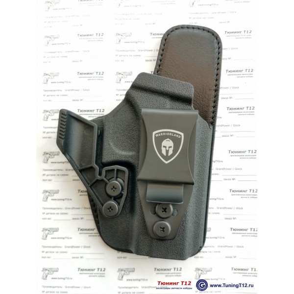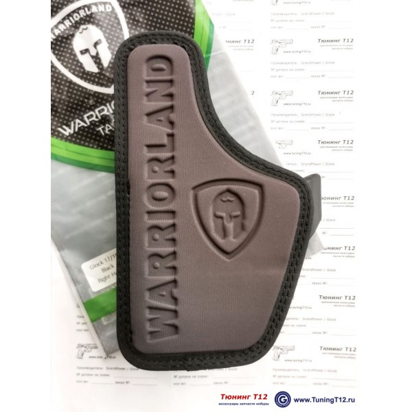 Модель WRL-1709-CL Black - гибридная кобура из полимера, кожи и нейлона для скрытого ношения пистолетов Glock 17/G19 внутри штанов. Со съёмным боковым упором ("когтем"). Крепление кобуры на ремень шириной до 40 мм осуществляется на стальной клипсе (регулируемой по высоте и углу наклона). Пистолет фиксируется в кобуре за скобу. Есть регулировка плотности посадки пистолета в кобуре - три прижимных винта. Формовка полимера выполнена по точной 3D модели пистолета Glock. Полимер матового чёрного цвета с фактурной структурой под кайдекс, кожа - черная. Производство компании Warriorland (США-Тайвань).
