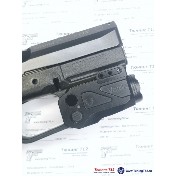 Подствольный тактический фонарь cо встроенным модулем ЛЦУ (зелёный лазер) от компании VectorOptics. Модель Vaide Scrapper VAPLL-G02. Корпус-моноблок из прочного алюминиевого сплава AL 6061-T6 c анодированным покрытием матового чёрного цвета. Ударозащищённый от падений с высоты до 1 м. Водонепроницаемый по стандарту IPX4 (защита от пыли и брызг). Быстросъёмное крепление на планку пикатини винтом. Две нажимные кнопки включения/выключения с правой и левой стороны на корпусе. Эти же кнопки служат для смены режимов работы и яркости фонаря. + Две тактические сенсорные кнопки Smart-Sense. Питание от встроенного аккумулятора Li-Ion на 500 mAh. В корпус встроен разъёмом для магнитной зарядки акб, а так же световой индикатор заряда батареи (цветной светодиод - зелёный/жёлый/красный). Время работы от 30 минут до 2 часов. Вес 82 грамма. Размеры (длинна, ширина, высота): 65х28х38 мм. Гарантия 12 месяцев. Производство компании Vaide - sub-brand Vector Optics (Китай).