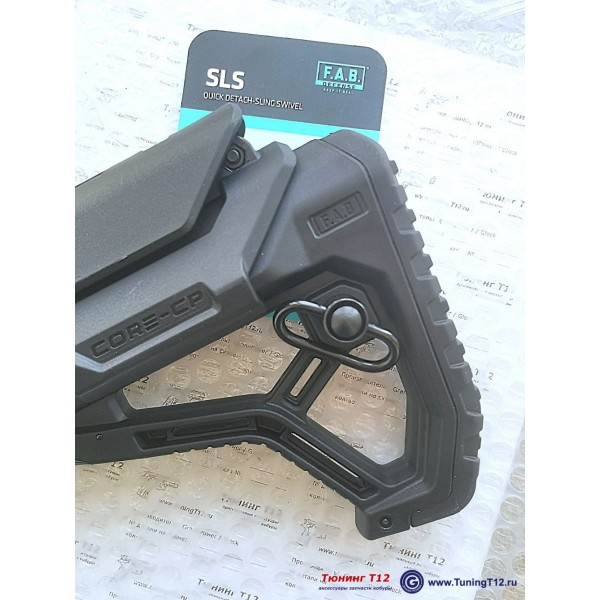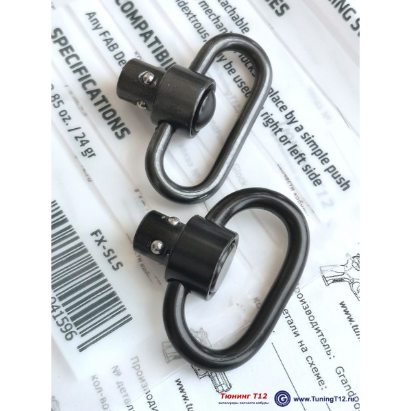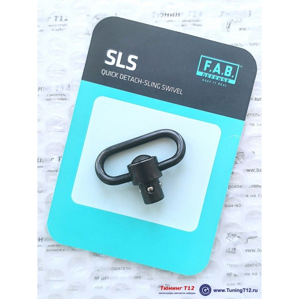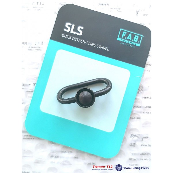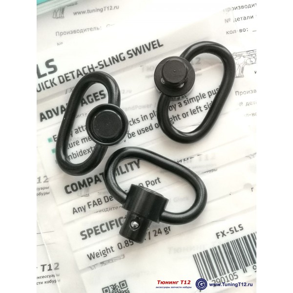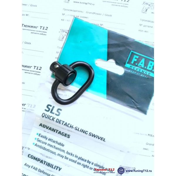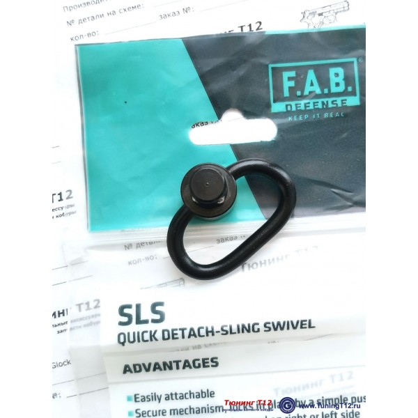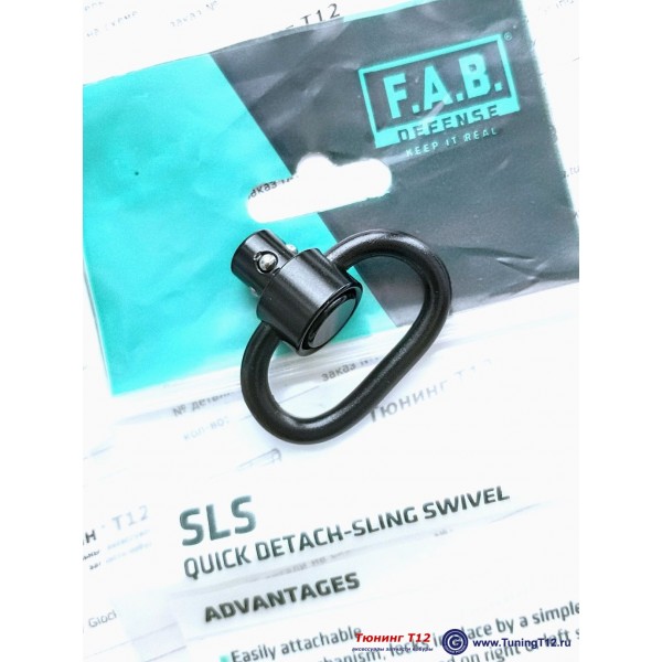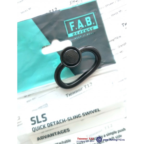 Быстросъёмная кнопочная QD антабка для крепления ремня от компании FAB Defense. Модель SLS. Оригинальный артикул: FX-SLS. Изготовлена полностью из высокопрочной стали (корпус и кольцо). Защитное покрытие - чёрная краска (новая модель 2025 года) или матовое черное оксидирование (старая модификация). Внутренние размеры петли - 30 мм. Вес 23 грамма. Производство компании "FAB Defense Ltd" (Израиль).