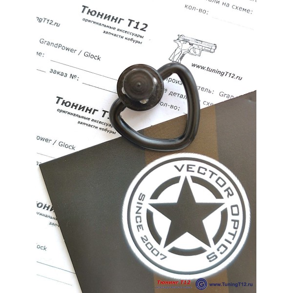 Быстросъёмная угловая кнопочная QD-антабка для крепления тактического ремня от компании VectorOptics. Модель GUSS-03. Изготовлена полностью из высокопрочной стали (корпус и петля). Защитное покрытие - чёрная краска. Внутренние размеры основания петли: 24 мм, общая высота 30 мм. Диаметр вставки 9,5 мм. Вес 25 грамм. Производство компании "Gunpany" - sub-brand Vector Optics (Китай).