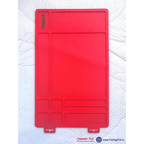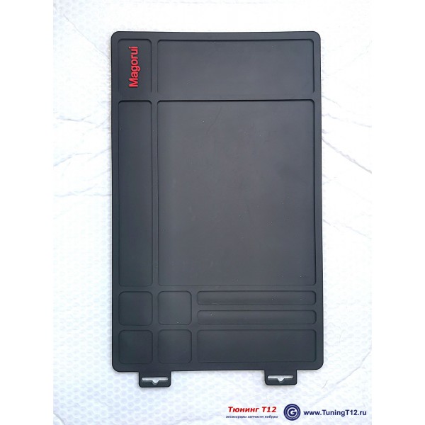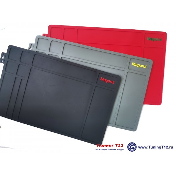 Полимерный коврик для чистки и смазки пистолетов с 3D секциями. Модель MGR Gun Mat Polymer. Изготовлен из цветного пластика (мягкого полимера). Цвета в ассортименте: светло серый, красный и чёрный. Маслобензостойкий и водонепроницаемый. Коврик разделён на десять секций разной площади (поддонов с 3D бортиками). Внешние размеры: 400x250 мм. Толщина 5 мм. Производство компании "Magorui" (Китай).