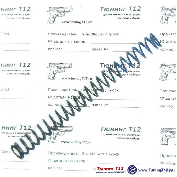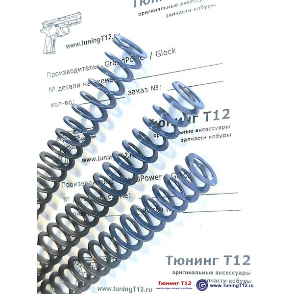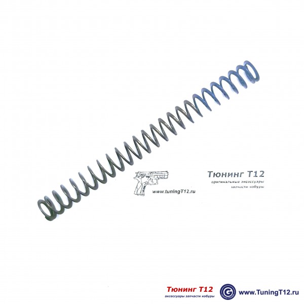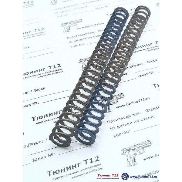 Российская листовая возвратная пружина для всех моделей пистолетов Grand Power T12. Усилие запирания затвора - 2,0 кг/ 4,5 lbs (минимальное) и максимальное усилие (затвор в самой задней точке) - 6.2 кг/13.5 lbs. Усилие полностью сжатой пружины - 7,5 кг/16,5 lbs.