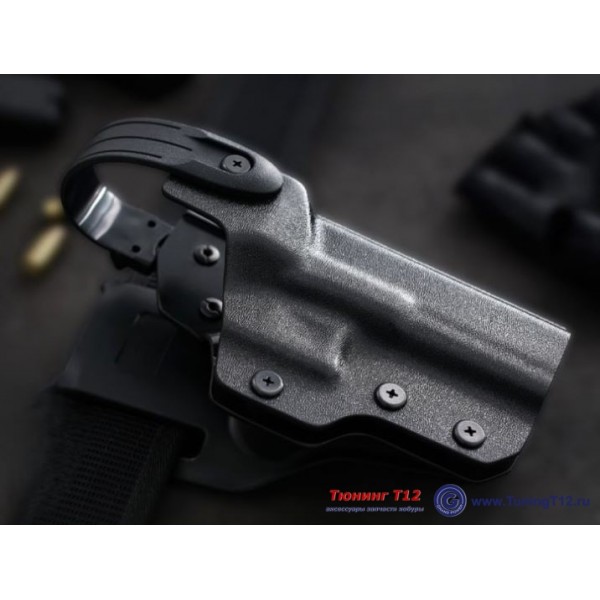 Максимально надёжная и универсальная модель - для ежедневного ношения личного и служебного оружия. Предназначенна для открытого ношения оружия на ремне в положении на 3-5 часов. Обеспечивает быстрое извлечение оружия и помещение его обратно в кобуру. Страховочная скоба (верхняя блокировка) обеспечивает надёжную фиксацию оружия в кобуре в любой ситуации, при любых действиях и активных движениях владельца. Кайдекс не мокнет, не меняет форму, не изнашивается и не пачкается. Кобура жёсткая и максимально безопасная для ношения заряженных безкурковых пистолетов Glock.