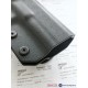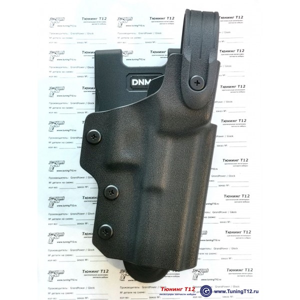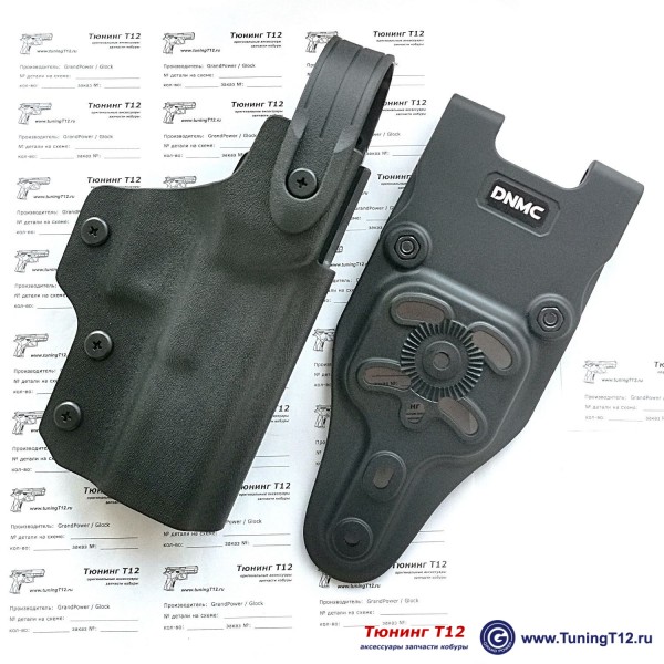 Модель DNMC-1734 Kydex Black - поясная закрытая кобура из кайдекса для наружнего ношения на ремне пистолетов Glock 17 и G19. Тактическая модель с системой активной фиксации оружия Level 2. Крепление кобуры на ремень осуществляется через универсальные платформы из полимера MRS-3 или MRS-3N. Платформы имеют петли под ширину ремня от 35 до 55 мм. Фиксация кобуры на крепление доступна с наклоном в +- 30 градусов от вертикали. Кобура изготовлена из усиленного кайдекса толщиной 3.2 мм (KYDEX производста USA). Имеет прецизионную регулировку плотности посадки пистолета в кобуре - 3 (!) прижимных винта (полноценное пассивное удержание). Ручная формовка выполнена по точной 3D модели пистолетов Glock. Цвет кайдекса матовый чёрный, внешняя поверхность фактурная. Производство компании Dynamiс Holsters (Эстония).