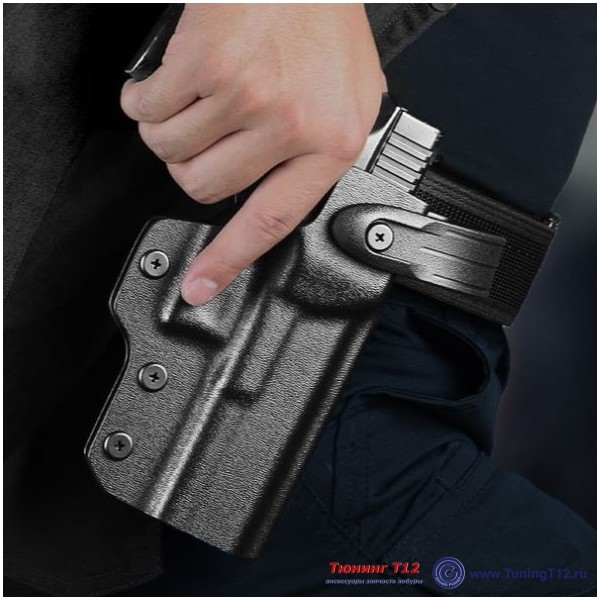 Преимущества модели: форма кобуры не закрывает полностью скобу пистолета - это даёт возможность сразу формировать правильный хват рукоятки, при извлечении оружия из кобуры. Позволяет носить пистолет с установленным на затворе любым коллиматорным прицелом. Подходит для высоких мушек до 10 мм. Открытая снизу - подходит для ношения пистолетов с удлинённым стволом с резьбой (с защитной гайкой), с установленным глушителем или ДТК. Кайдекс увеличенной толщины делает эту модель кобуры "неубиваемой" (т.е. всепогодной и всезезонной).
