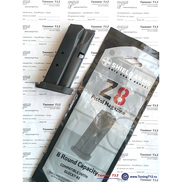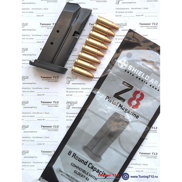 Преимущество модели: магазин имеет такой же по длинне корпус как и у стандартного магазина Glock 43 на 6 патронов. Но при этом вмещает 8 патронов калибра 9x19 (или 7 патронов калибра 10х28). Высокая надёжность работы магазина Shield Arms Z8 и безупречная подача патронов. Разработан и полностью изготовлен в США.